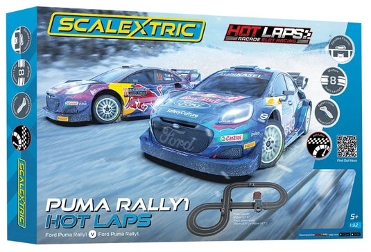 2x Slot Cars (Ford Puma Rally Cars), 2x Hand Controllers, 3x 584mm Straight Track, 1x 584mm Powerbase Track, 12x Radius 2 45º Curved Track, 1x 15v Wall Adaptor, 8x Large Support Feet, 2x Track Supports, 1x Cardboard Track Supports, 1x Flat Pack Overhead Gantry, 4x Spare Guide Blades, 1x Instructions